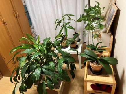 自宅マンションで観葉植物を育てています。胡蝶蘭が3株増え5株になりました。毎年白い花を咲かせるスパティフィラム。そしてパキラ、2鉢のポトスがあり、6畳の和室は観葉植物の部屋になりました。ポトスは長くなった葉を切って水栽培にしています。増える一方ですでに3つの容器に水栽培をしています。