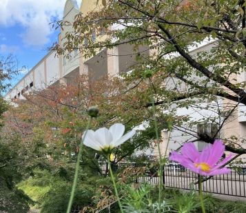 10月23日(木)にテニスに行って以来2週間ぶりとなります。月曜日のレギュラークラスには、10月13日(月)に行ったきり…。2週間ぶりに行くと木々が色づき少し紅葉していました。コスモスが咲き、秋らしい風景になっていました。季節は「秋」ですが今日は気温が高くテニスでは半袖でも汗だくでした。