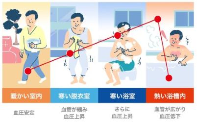 急に寒くなると「ヒートショック」に注意が必要です。「(部屋の温度)暖かい」⇒「(脱衣所)寒い」⇒「(湯船)熱い」の状況が危険です。これは気温の変化によって血圧が上下し、心臓や血管の疾患が起こすことが原因です。脳内出血、大動脈解離、心筋梗塞、脳梗塞などの病気が起こります。