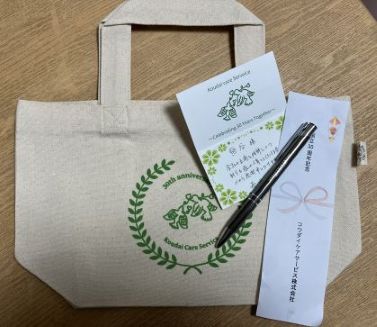 2026年(令和7年)11月で会社創立30周年となりました。先日、神戸で記念パーティがありましたが、勤務等で参加できなかったスタッフにトートバックとボールペンの記念品が渡されました。参加した人は当日頂いています。