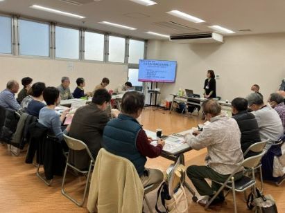 午前11時〜45分間、高齢者見守り安心研修を尼崎市重層的支援から出前講座に来ていただき「ささえあう地域社会を目指して」をテーマに学習会を行いました。